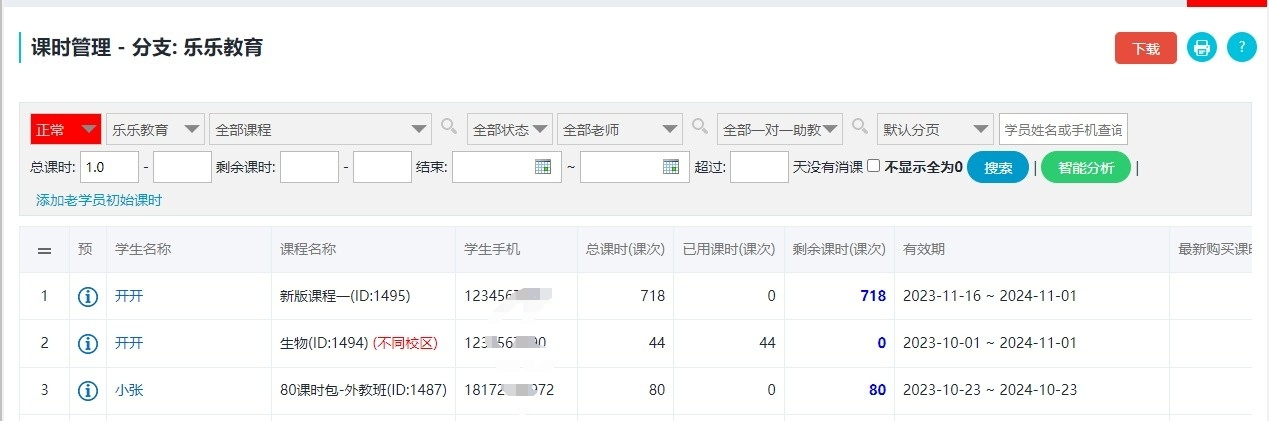 课时,是学员或学员家长购买课程的课时数,用于机构上课后消课扣课时,和记录学员到课情况。机构不同节假日可能推出不同的优惠套餐,每个家长购买课时数不同,日常出勤率不同,最终每个学员的剩余课时也是不一样的。如何查询学员的课时/剩余课时/购买课时/已用课时/总课时?校睿宝学员课时管理软件是一款适用于各类培训机构管理学员课时的教务管理系统,只需登录系统即可随时随地查询每个学员的课时/剩余课时/购买课时/已用课时/总课时。
