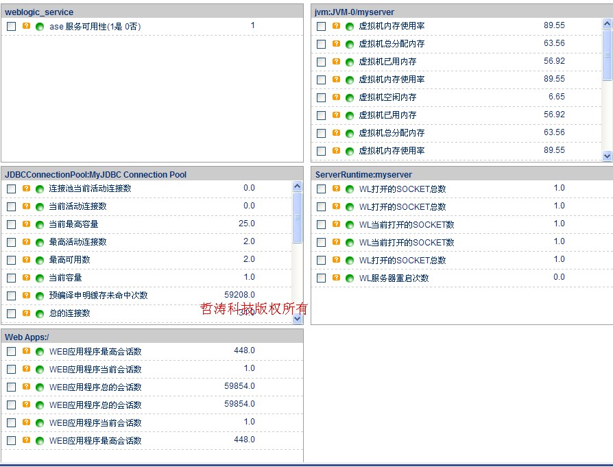 Weblogic的监控是对Weblogic中间件进行监控的软件,主要监控Weblogic的虚拟机内存监控、对Weblogic的数据库连接池进行监控、对Weblogic网站的会话数进行监控、对JMS会话进行监控等状态监控功能。